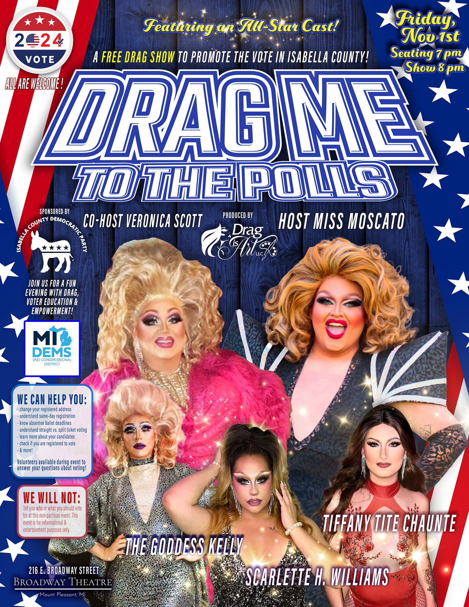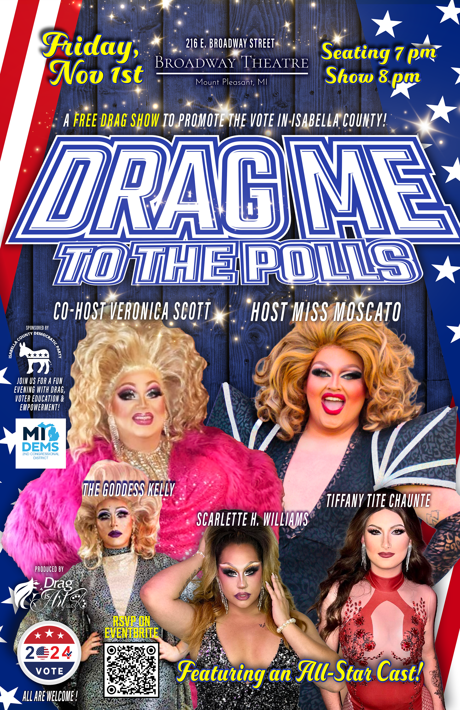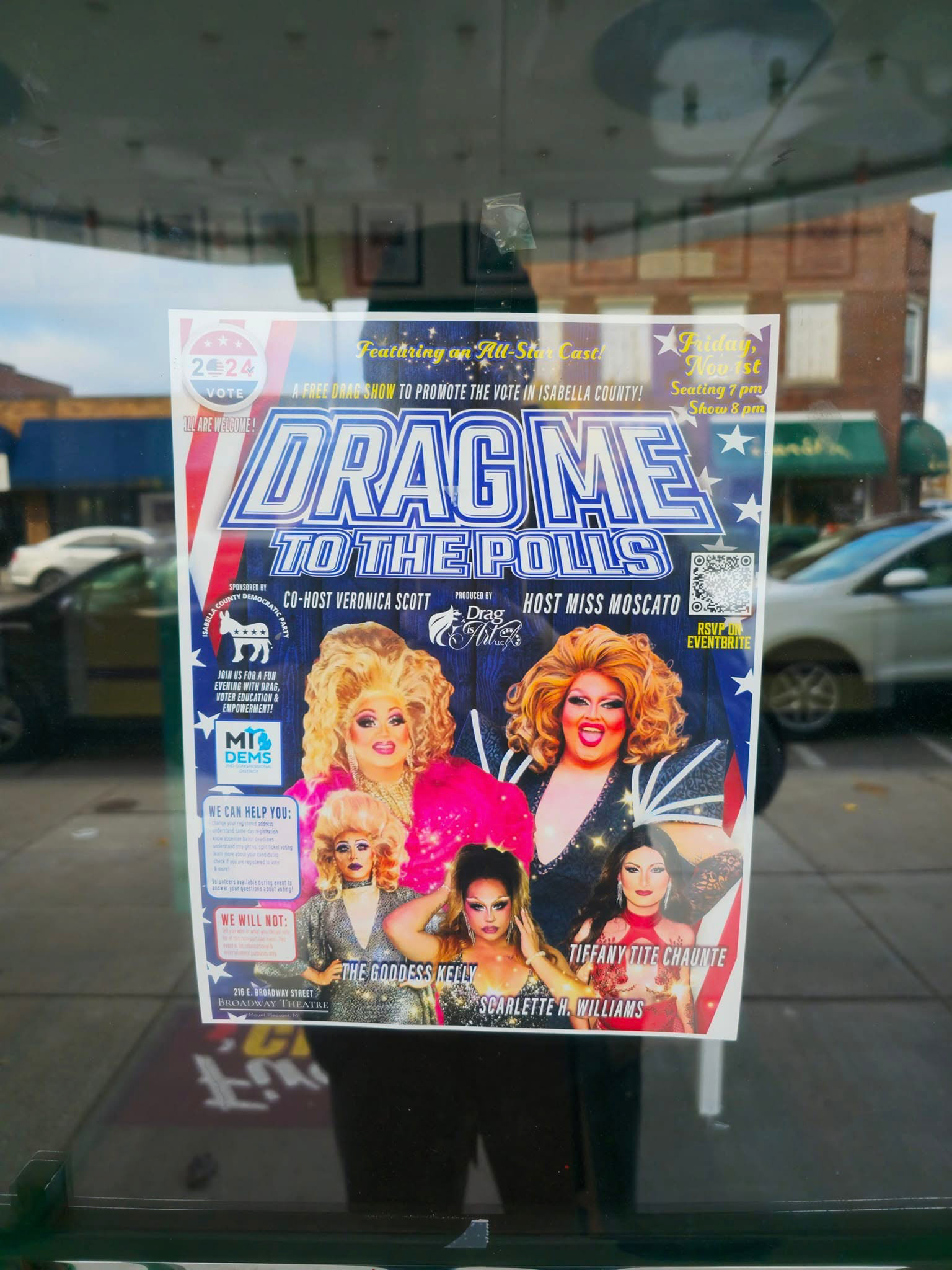 Drag is Art was hired by the Isabella County Democratic Party to put on a Drag Me to the Polls show that encouraged voting for the 2024 election.