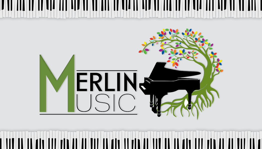 MERLIN MUSIC - LOCAL MUSICIAN/PIANO TEACHER LOGO (ON BUSINESS CARD)